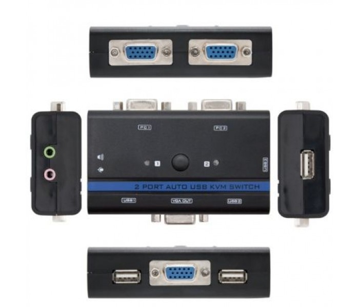 Especificación:. Conexiones CPU: 2 Sub-D 15pin macho, 2xUSB macho, 4x Jack 3.5. Conexiones consola: 3xUSB hembra + 1 VGA HDB 15pin hembra + 2 Jack 3.5. Cables incluidos: 2xVGA, 2xJack 3.5(auriculares), 2xJack 3.5(micrófono), 2xUSB. Resolución máxima:1920x1440, ancho de banda: 250 Mhz. Indicador LED para comprobación de estado. Selección de PC mediante botón o comando de teclas. Requisitos mínimos de sistema: Monitor, teclado y ratón USB, 2 ordenadores (PC u ordenador portátil) con puerto USB 1.1 o 2.0 libre. Longitud: 1.4 metros. Color: Negro. NormativaS: RoHS. Test de Funcionamiento: 100% testado