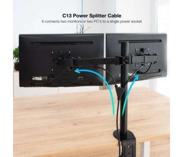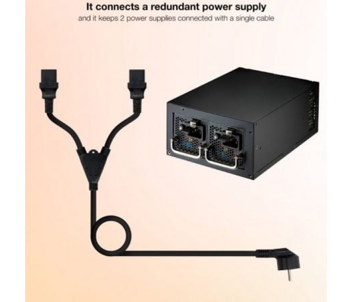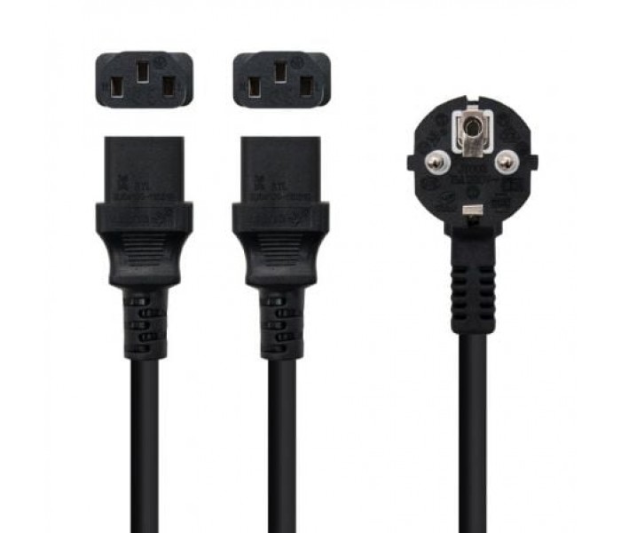 ¡Ahora con nuestro cable de alimentación podrás optimizar los enchufes de tu regleta! Conecta dos ordenadores a una misma toma de corriente y quítate de líos. Perfecto para usar en ámbito doméstico o entornos profesionales. . . Características principales:. . El cable de alimentación cuenta con un conector Schuko macho en un extremo y dos conectores C13 hembra en el otro.. . ¡Nunca ha sido tan fácil! Conecta tus dos pantallas a la red eléctrica utilizando solamente un enchufe.. . Nuestro cable también está pensado para dar energía a una fuente de alimentación con dos entradas C13.. . Especificaciones:. . Se utiliza para conectar dos PCs o dos monitores a una toma de corriente. Conector 1: Schuko (CEE7/7) macho. Conector 2: 2 x C13 hembra. Calibre del cable: H05VV-F 3X0.75m2. Longitud: 1.8 m . Color: Negro. NormativaS: RoHS
