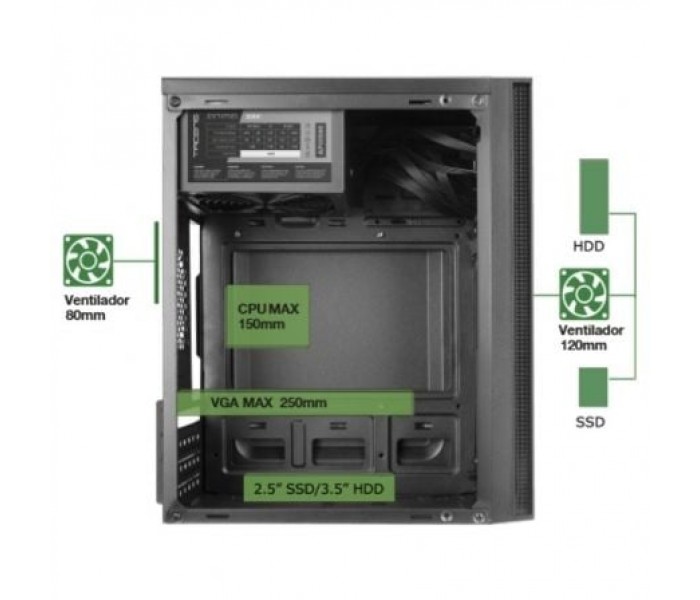Características:. . Diseño. Caja de ordenador compacta Micro-ATX / Mini-ITX de alto rendimiento diseñada para ofrecer una estética minimalista y elegante, con una gran funcionalidad y una refrigeración sobresaliente. Cuenta con un frontal de con una malla completa de refrigeración y un acabado negro profesional que encaja perfectamente en contextos tanto domésticos como de oficina.. . Prestaciones. Dispone de una estructura totalmente optimizada y actualizada a las últimas tendencias para un montaje fácil y accesible ofreciendo, además, una total conectividad para tus periféricos. Dispone de multiples bahías internas para diferentes combinaciones de discos duros (2 x 2.5" SSD o 2 x 3.5" HDD).. . Conectividad. Cuenta con puerto USB 3.0, USB 2.0, micrófono y audio HD en el panel frontal que te permiten conectar tus periféricos con total comodidad.. . Refrigeración. Aparte de su rejilla frontal completa, cuenta con un amplio soporte para ventilación, permitiéndote instalar un ventilador frontal y otro lateral de 12cm, además de uno de 8 cm en la parte trasera.. . Fuente de alimentación de 500W. . Incluye una fuente de alimentación de última generación SMD de 500W equipada con un ventilador de 12cm ultrasilencioso de 14dB, con un sistema antivibraciones. Completamente negra y con cables negros para mantener una estética perfecta. Además, cuenta con una eficiencia energética estable del 85% y todas las protecciones de seguridad y las certificaciones europeas, garantizando el mejor rendimiento y estabilidad para tu PC.. Especificaciones:. Tipo: Caja Mini Torre. Placas: MicroATX / Mini-ITX. Estructura: Optimizada con múltiples bahías para un montaje fácil y accesible. Conectividad: USB3.0 x1 / USB2.0 x2 / HD Audio + Mic. Bahías: 2x 3.5"" HDD / 2x 2.5"" SSD. Ventilación: 1x 120mm frontal, 1x 120mm lateral, 1x trasero 80mm. Ranuras de expansión: 4. VGA: 250mm. CPU: 145mm. Fuente de alimentación: 500W ATX con ventilador de 12cm. Conectores: 1xATX 20+4pin/ 1x EPS 4+4pin/2x SATA/2x PATA. Dimensiones: 291x188x345