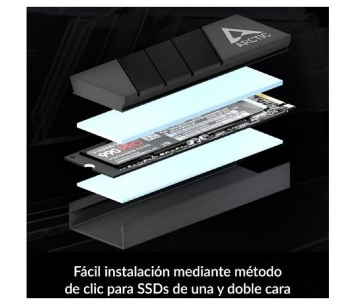 El montaje del ARCTIC M2 Pro no requiere tornillos ni gomas elásticas. En su lugar, el SSD se coloca entre los disipadores mediante un sistema de clic. El disipador NVMe para SSD está diseñado para SSD M.2 2280 de una y dos caras. Las diferencias de altura se compensan con la almohadilla térmica incluida.