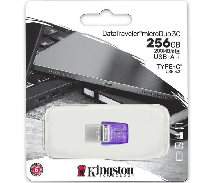 DataTraveler microDuo 3C tiene una doble interfaz que funciona con los nuevos USB Type-C y los puertos USB Type-A tradicionales. Es una forma ideal de liberar espacio en tu smartphone o tableta con hasta 256 GB2 de almacenamiento adicional para fotos y vídeos. El atractivo formato ofrece una cómoda conectividad plug and play. Transfiere rápidamente archivos entre tus dispositivos a una velocidad de hasta 200 MB/s de lectura por el USB 3.2 Gen 13.