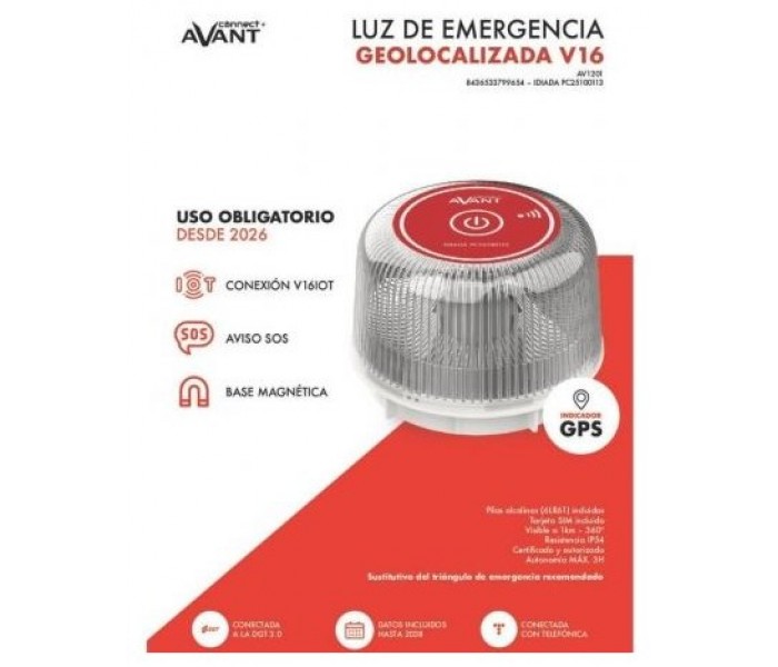 La luz de emergencia Avant V16 (AV1201) es una solución de seguridad vial moderna y obligatoria (a partir de 2026) que reemplaza al triángulo de emergencia. Cumple con los requisitos de la DGT, integrando geolocalización, indicador GPS, conectividad y una base magnética para facilitar su uso en carretera.