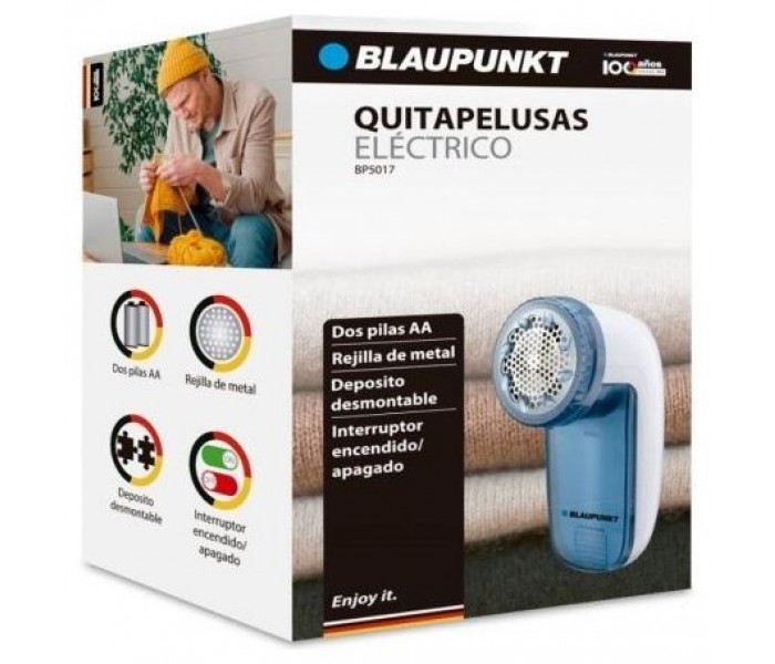 Blaupunkt BP5017 es un quitapelusas eléctrico a pilas con rejilla metálica, depósito desmontable, 2 velocidades y 3 longitudes de corte para renovar tejidos sin dañarlos. Funciona a 3 V con 2 pilas AA (incluidas).
