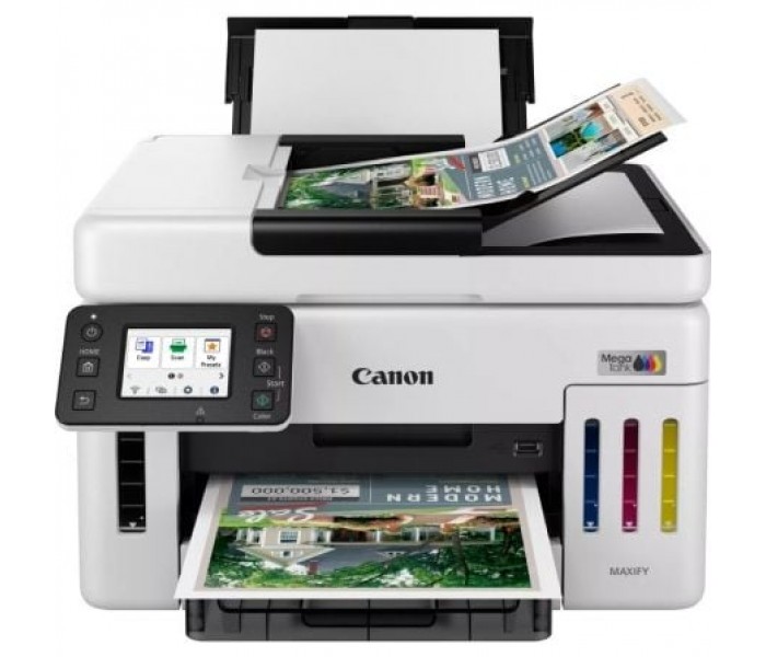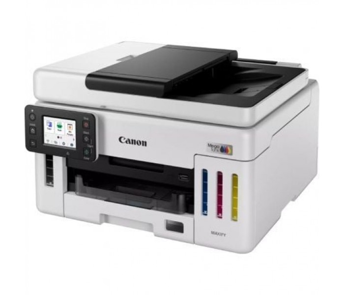Resolución de impresión . Hasta 600 x 1200 ppp. . Márgenes de impresión (mín.) . Superior: 3 mm, inferior: 5 mm, izquierda y derecha: 3,4 mm . . Tecnología de impresión . 1 cabezal de impresión. Impresora con depósito de tinta rellenable . . Velocidad de impresión en blanco y negro . Aprox. 24 ipm. . Velocidad de impresión en color . Aprox. 15,5 ipm. . Tiempo de salida de la primera impresión . Blanco y negro: 5,5 s (lista) . Color: 7 s (lista)5 . . Impresión a dos caras . Impresión automática a doble cara [A4, Carta: papel normal (64 g/m²), Canon Red Label Superior (WOP111), papel Canon Oce Office Colour (SAT213)] . . Consumibles y rendimientos. . Botellas de tinta estándar . GI-56 BK. GI-56 C. GI-56 M. GI-56 Y. . Cartucho de mantenimiento . MC-G01 (sustituible por el usuario) . . Rendimiento de la botella (papel normal) . Impresión de documentos en color A46 . Negro: 6000 páginas (9000 páginas en el modo económico). Color: 14 000 páginas (21 000 páginas en el modo económico). * Rendimiento adicional estimado . . Compatibilidad de papel. Tipos de papel . Papel normal (64-105 g/m2) . Red Label Superior 80 g/m2 (WOP111), . Canon Oce Office Colour Paper 80 g/m2 (SAT213) . Papel fotográfico Pro Luster (LU-101), . Papel fotográfico Brillo II (PP-201) . Papel fotográfico Mate (MP-101), . Papel fotográfico Brillo de «uso diario» (GP-501) . Papel de alta resolución (HR-101N), . Sobre, . Papel fotográfico Plus Semi Brillante (SG-201), . Papel fotográfico adhesivo (RP-101) . Papel fotográfico magnético (MG-101) . Papel de transferencia térmica para tejidos claros (LF-101), . Papel mate de doble cara (MP-101D) . . Entrada máxima de papel . Bandeja posterior: máx. 100 hojas (papel normal) . Casete: máx. 250 hojas (papel normal) . ADF: A4, A5, LTR: 50 hojas, LGL: 10 hojas . . Tamaños del papel . Bandeja posterior: A4, A5, A6, B5, LTR, LGL, 4"" x 6"" (10 x 15 cm), 5"" x 7"" (13 x 18 cm), 7"" x 10"" (18 x 25 cm), 8"" x 10"" (20 x 25 cm), Cuadrado 5"" x 5"", (127 x 127 mm), Sobres (DL, COM10, C5), Tamaño personalizado (anchura: de 89 a 216 mm, longitud: de 127 a 1200 mm). Casete: A4, LTR, A5, B5. ADF: A4, A5, LTR, LGL. . Gramaje del papel . Bandeja posterior: papel normal: 64 g/m2 - 105 g/m2 o papel original de Canon compatible. Papel Canon: peso máx. aproximado de 265 g/m2. (Papel fotográfico brillo II [PP-201]). . Casete: papel normal, Canon Red Label Superior (WOP111), papel Canon Oce Office Colour (SAT213): 64-105 g/m2 . . Especificaciones del escáner. . Tipo de escáner . Escáner plano (ADF/Cristal de copia) y color CIS . . Velocidad de escaneo . Una cara. 16,9 ipm en color. Una cara. 22,1 ipm en blanco y negro . . Resolución del escáner (óptica) . 1200 x 1200 ppp . . Velocidad de escaneo por línea . Color: 1,4 ms/línea (300 ppp) . Escala de grises: 1,4 ms/línea (300 ppp) . . Profundidad de escaneo (entrada/salida) . Color: RGB cada 8 bits . Escala de grises: 8 bits . . Tamaño máximo del documento . Platina: A4/Carta (216 x 297 mm) . ADF: A4/Carta/Legal (216 x 356 mm) . . Especificaciones de la copiadora. Velocidad de copia . sFCOT/a una cara (color): aprox. 12 segundos . sESAT/a una cara (color): aprox. 12,7 ipm. ADF ESAT/a una cara (color): aprox. 12,2 ipm. ADF ESAT/a una cara (negro): aprox. 22,2 ipm. . Calidad de copia . 3 niveles (económico, estándar, alto) . . Ajuste de intensidad . 9 niveles (ajuste automático disponible, copia AE) . . Copia múltiple . 99 copias (máx.) . . Funciones de copia . Copia de documentos, copia a doble cara, copia a doble cara manual con ADF, copia 2 en 1, copia 4 en 1, copia clasificada (solo ADF), copia con eliminación de bordes (solo superficie plana), copia de carné de identidad . . Copia con zoom . De 25 a 400 % . . Ajuste a página . De A5 a A4, de B5 a A4, de A4 a A5 y de A4 a B5 . . Especificaciones de fax. . Tipo de fax . Súper G3 / Color . . Interfaz. Tipo y tamaño de pantalla . LCD de 2,7""/6,9 cm (pantalla táctil, color) . . Idiomas de visualización . Posibilidad de seleccionar entre 33 idiomas: japonés, inglés (mm y pulg.), alemán, francés, italiano, español, portugués, neerlandés, danés, noruego, sueco, finlandés, ruso, ucraniano, polaco, checo, esloveno, húngaro, eslovaco, croata, rumano, búlgaro, turco, griego, estonio, letón, lituano, chino simplificado, coreano, chino tradicional, tailandés, indonesio, vietnamita . . Conectividad. LAN cableada . Protocolo de comunicación: SNMP/HTTP/TCP/IP (IPv4/IPv6). TLS 1.3/1.2/1.1/1.0. Estándares compatibles: IEEE802.3u (100BASE-TX) / IEEE802.3 (10BASE-T). Velocidad de transferencia: 10 Mbps/100 Mbps (conmutación automática). Seguridad: IEEE 802.1X (EAP-TLS/EAP-TTLS/PEAP). . LAN inalámbrica . Protocolo de comunicación: SNMP/ HTTP/TCP/IP (IPv4/IPv6). TLS 1.3/1.2/1.1/1.0. Estándares compatibles: IEEE802.11n/IEEE802.11g/IEEE802.11b/IEEE802.11a//IEEE802.11ac 1117. Ancho de banda de frecuencia: 2,4 GHz/5 GHz. Alcance: Interior 50 m ;según las condiciones y la velocidad de transmisión. Seguridad: WPA-PSK (AES). WPA2-PSK (AES). WPA3-SAE (AES). WPA-EAP (AES)*. WPA2-EAP (AES)*. WPA3-EAP (AES)*. *IEEE802.1X (EAP-TLS/EAP-TTLS/PEAP) disponible. . Interfaz . USB de alta velocidad (puerto B) . . Aplicaciones móviles . Aplicación Canon PRINT Inkjet/SELPHY. Aplicación Easy-PhotoPrint Editor. . Funciones de impresora. Cloud Link (imprimir). Complemento Canon Print Service (Android). Apple AirPrint. Wireless Direct. Mopria (Android). Asistente inteligente y ayuda de automatización. Amazon Alexa™. . Software. Sistemas operativos compatibles . Windows 11, Windows 10, Windows 8.1, Windows 7 SP1. Solo se garantiza el funcionamiento en un PC con el sistema operativo preinstalado.. El control de la impresora e IJ Printer Assistant Tool son compatibles con los siguientes sistemas operativos: Windows Server 2008 R2 SP1, Windows Server 2012 R2, Windows Server 2016, Windows Server 2019, Windows Server 2022 y Windows Server 2025.. Entorno de pantall