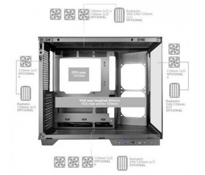 • Soporte refrigeración líquida: 360mm, 240mm, 120mm superior / 240mm, 120mm inferior / 240mm, 120mm interior / 120mm trasero