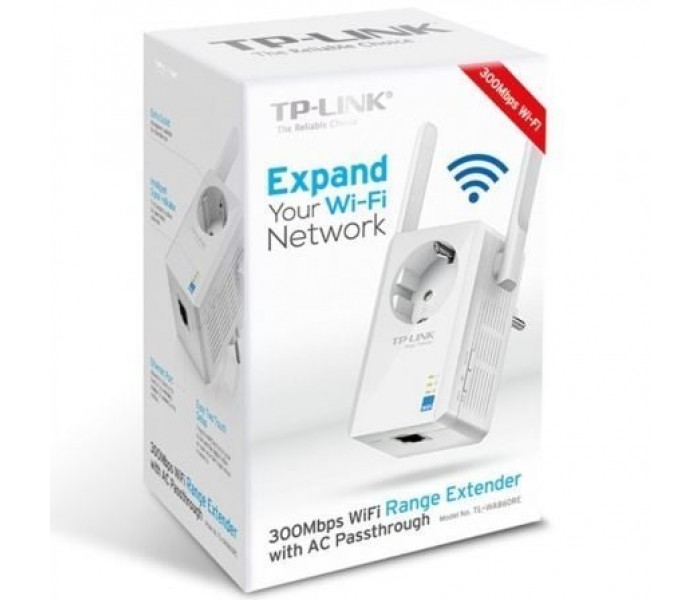 Extensor de Rango Wi-Fi a 300 Mbps con enchufe adicional. El TL-WA860RE de TP-LINK está diseñado para expandir cómodamente la cobertura y mejorar la intensidad de la señal de una red inalámbrica existente para eliminar las “zonas muertas”. Con velocidades inalámbricas N a 300Mbps, botón Range Extender y diseño de tamaño en miniatura para montaje en pared, expandir una red inalámbrica nunca había sido tan sencillo. Más, su toma de corriente extra hace que ésta esté disponible para otros dispositivos eléctricos. Además, su Puerto Ethernet permite al TL-WA860RE actuar como un adaptador inalámbrico para convertir un dispositivo cableado en uno inalámbrico.