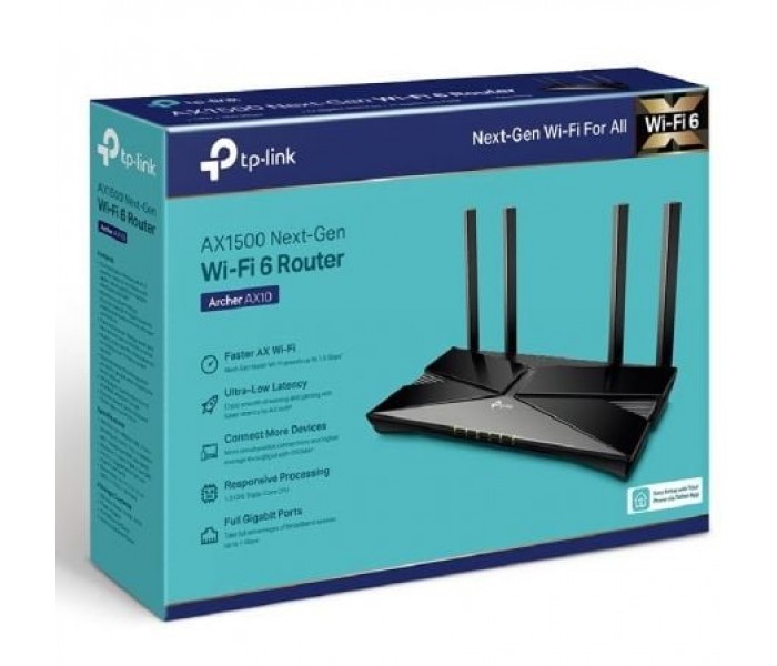 TP-LINK Archer AX10. Tipo de conexión WAN: RJ-45. Banda Wi-Fi: Doble banda (2,4 GHz / 5 GHz), Estándar Wi-Fi: Wi-Fi 6 (802.11ax), Tasa de transferencia de datos WLAN (máx.): 1500 Mbit/s. Tipo de interfaz Ethernet LAN: Gigabit Ethernet, Estándares de red: IEEE 802.11a,IEEE 802.11ac,IEEE 802.11ax,IEEE 802.11b,IEEE 802.11g,IEEE 802.11n, Ethernet LAN, velocidad de transferencia de datos: 10,100,1000 Mbit/s. Algoritmos de seguridad soportados: 64-bit WEP,128-bit WEP,WPA,WPA-PSK,WPA2,WPA2-PSK, Seguridad con cortafuegos: SPI. Protocolos de red compatibles: IPv4, IPv6