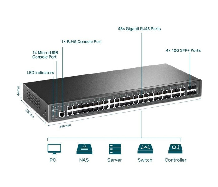 TP-Link TL-SG3452X. Tipo de interruptor: Gestionado, Capa del interruptor: L2+. Puertos tipo básico de conmutación RJ-45 Ethernet: Gigabit Ethernet (10/100/1000), Cantidad de puertos básicos de conmutación RJ-45 Ethernet: 48, Puerto de consola: RJ-45. Tabla de direcciones MAC: 16000 entradas, Capacidad de conmutación: 176 Gbit/s. Estándares de red: IEEE 802.1D, IEEE 802.1Q, IEEE 802.1s, IEEE 802.1w, IEEE 802.3ad. Montaje en rack, Factor de forma: 1U