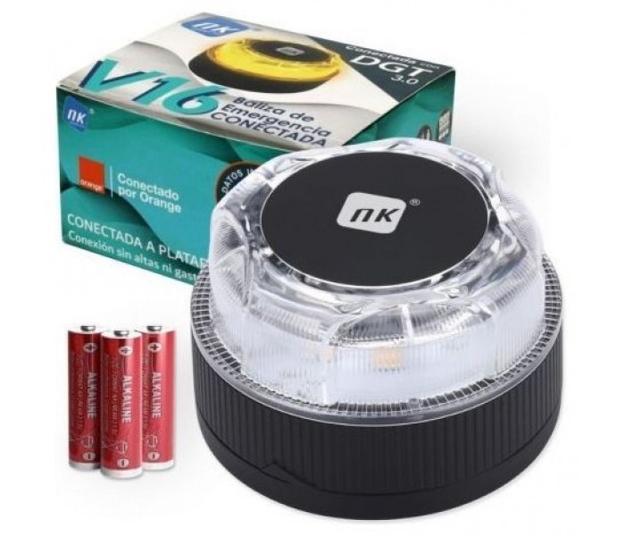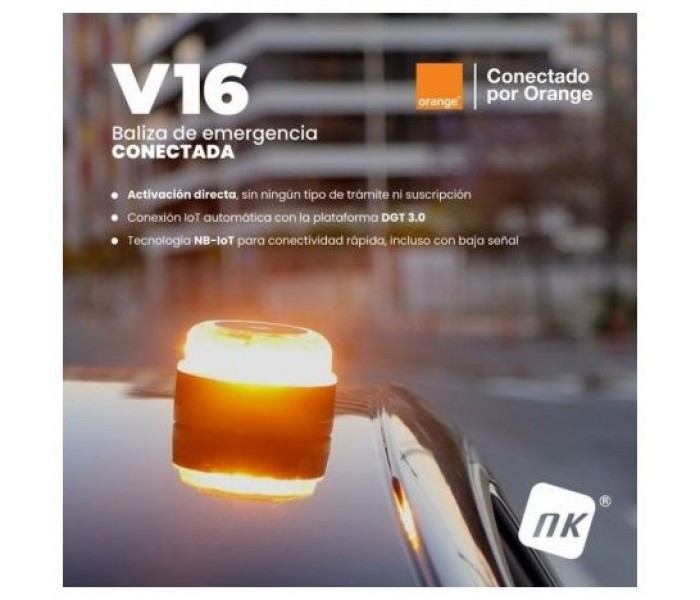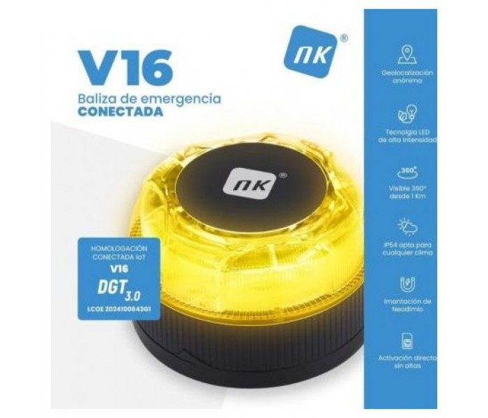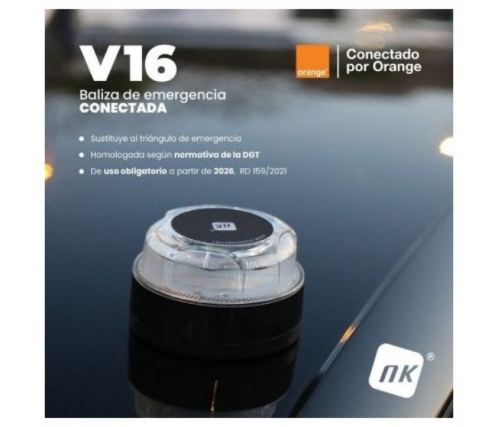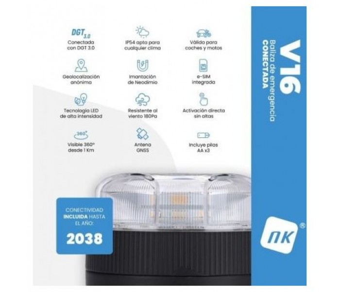 NK Baliza V16 conectada a DGT 3.0. Visible 360°, datos incluidos hasta 2038, uso sin apps ni cables, resistente al agua