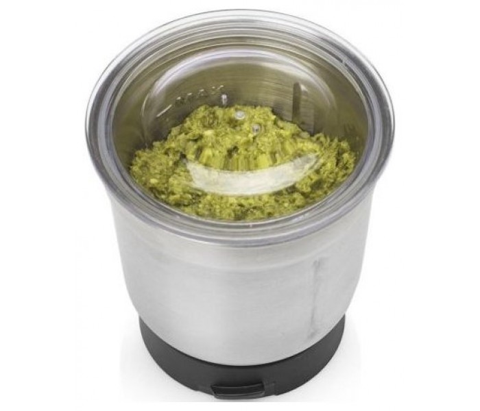 - Dos recipientes extraíbles en acero inoxidable: uno para picar ajo y hierbas frescas, y otro para moler granos de café y especias.