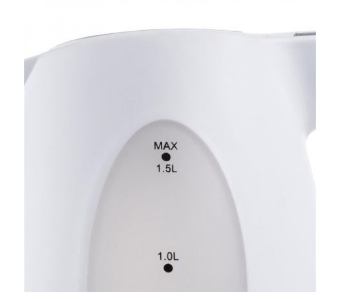 - Hervidora de agua práctica con una carcasa blanca de plástico y un volumen de 1,5 litros.