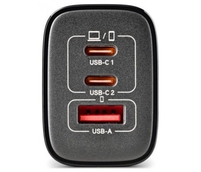 • Cargador GaN de pared con 2 salidas USB-C (PD & PPS) y una salida USB-A QC 3.0 de 65W de potencia máxima para cargar dispositivos de manera rápida y eficiente.