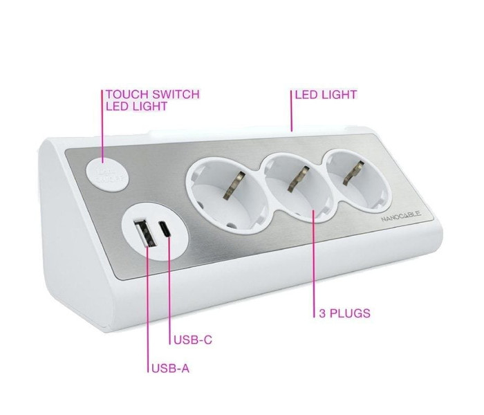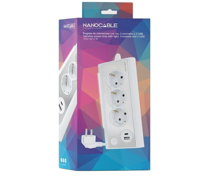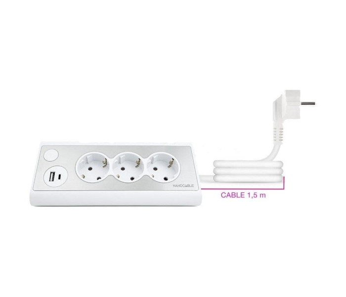 Regleta con Interruptor Nanocable 10.37.0013-W/ 3 Tomas de Corriente/ 1 USB/ 1 USB Tipo-C/ Cable 1.5m/ Blanca