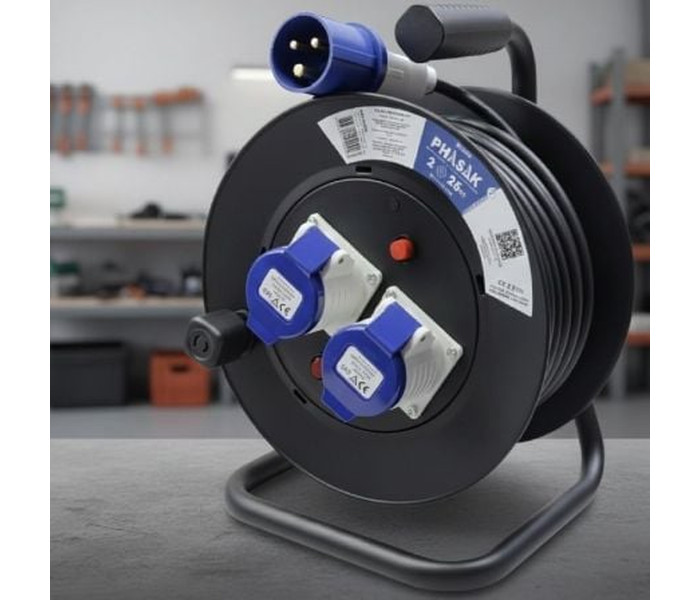 Regleta enrollable PHASAK 2× enchufe industrial 2P+TT con protección – 25 m (BN 3475)