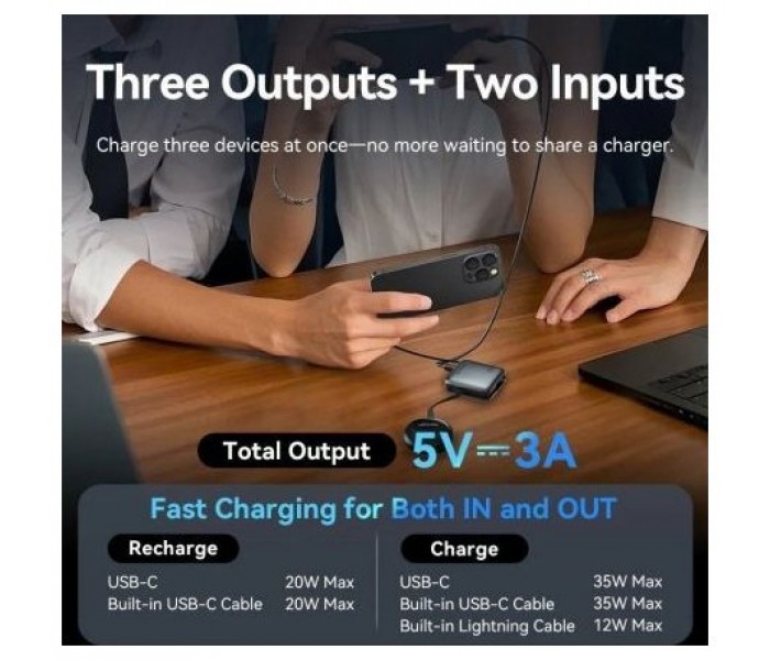 • Salida (cable USB-C integrado): 5V⎓3A; 9V⎓3A; 12V⎓2.92A; 15V⎓2.33A; 20V⎓1.75A (35W Máx)