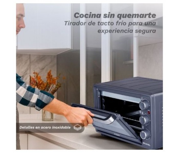 Horno eléctrico de GRUNKEL HR-23EASY, 23 L, 1600W, 3 funciones, 150–230 °C, temporizador 60 min con aviso, tirador frío y acabado inox.