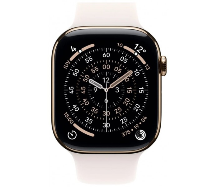 • Tamaño y peso: 42 mm (alto) x 36 mm (ancho) x 9,7 mm (grosor), 374 x 446 píxeles, superficie de pantalla de 989 mm², peso aluminio GPS 30,3 g, aluminio GPS + Cellular 29,7 g, titanio 34,6 g, para muñecas de 130 a 200 mm