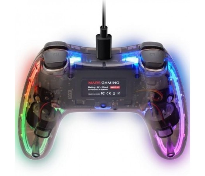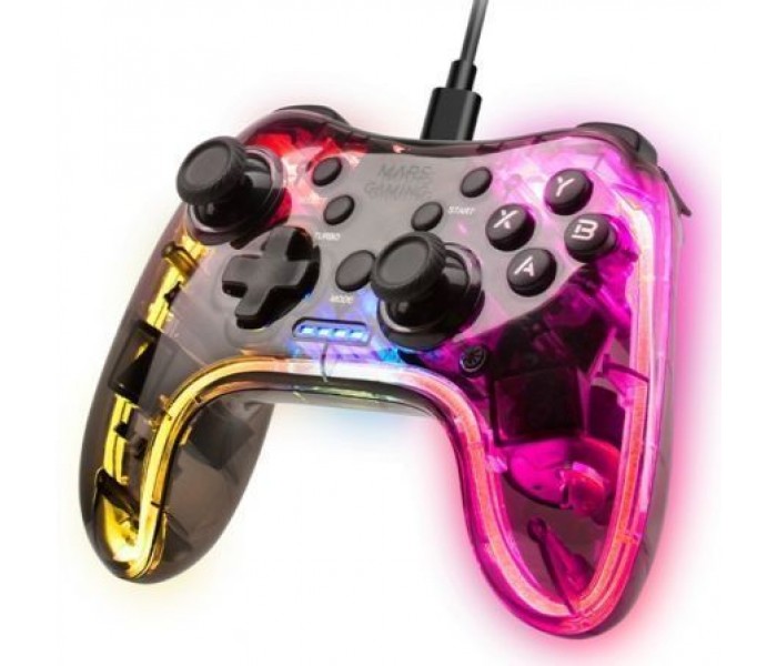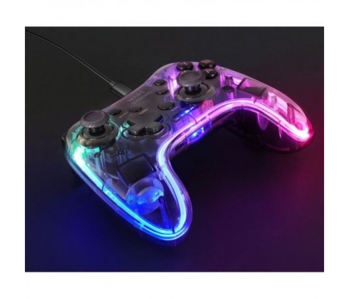 Gamepad profesional con un espectacular diseño translúcido negro e iluminación NEÓN RGB. Sistema de vibración háptica dual, cable extraíble USB-A / USB-C y compatibilidad superior multiplataforma