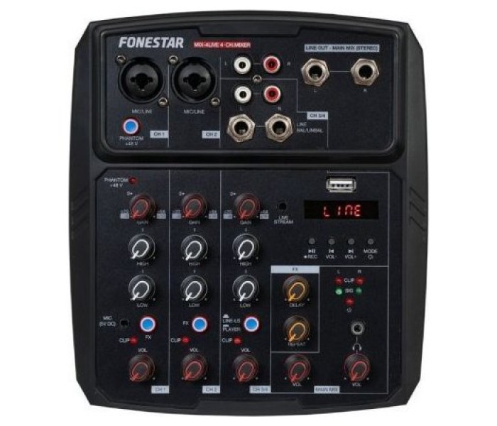 - Controles: 4 controles por canal: ganancia, ecualizador de 2 bandas, volumen e indicador luminoso clip