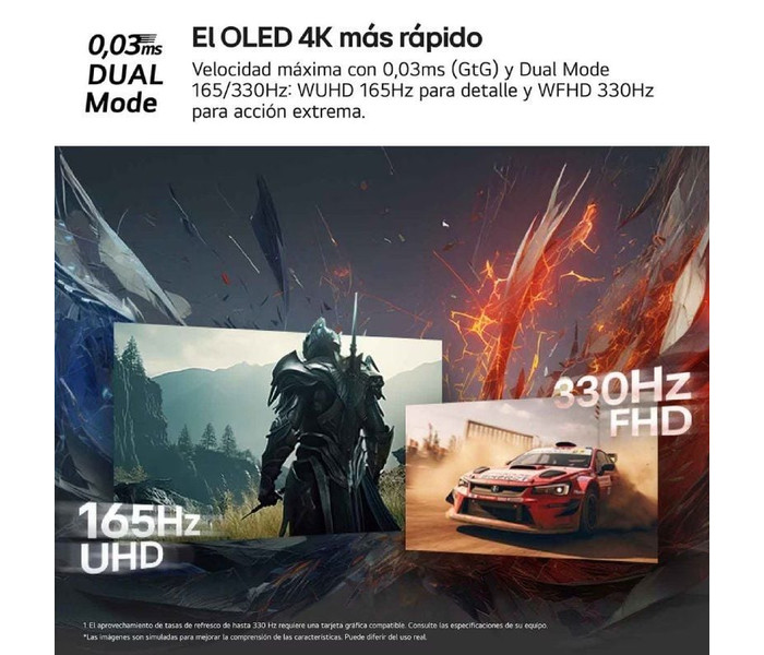• Descubre la nueva revolución OLED gaming 4K con la máxima velocidad de 0,03ms (GtG) y la innovadora tecnología Dual Mode (165/330 Hz)⁽¹⁾ que se adapta a tu estilo de juego en un solo clic.