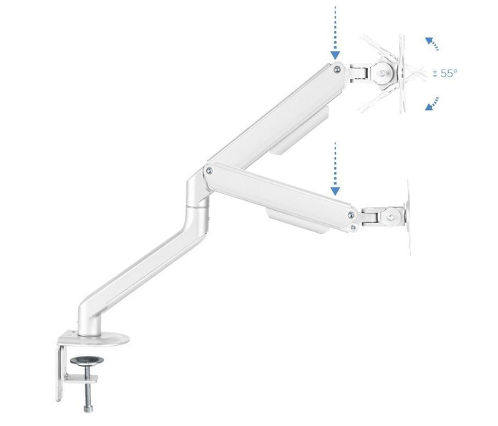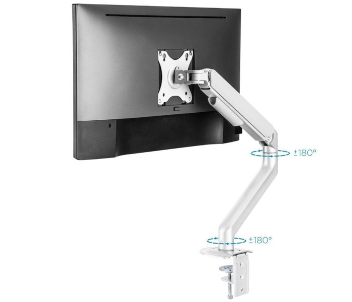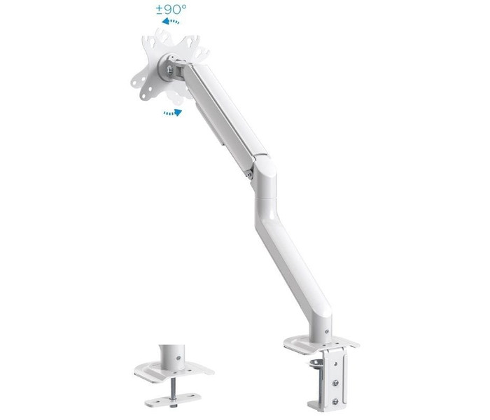 Agrega flexibilidad y ergonomía a tu lugar de trabajo.. Mueve sin esfuerzo el soporte con el mecanismo asistido por muelles. Adapta el monitor a la postura más cómoda que necesites para conservar una buena higiene postural. Disponible en dos colores: gris espacial y blanco. . . Especificaciones:. . Pantallas soportadas: 17""-32"". Compatible con VESA: 75x75 y 100x100. Peso máximo soportado de pantalla: 2-9 kg. Brazo regulable con mecanismo asistido por muelles. ángulo de inclinación: +55º/-55º. ángulo de giro: +90º/-90º. ángulo de rotación: +180º/-180º. Altura ajustable hasta 428 mm. Extensión máxima del brazo: 516 mm. Instalación mediante abrazadera o tornillo pasante. Sistema de organización de cables. Compatible con pantallas curvas. Color: Blanco. Peso neto: 2,2 kg. Peso bruto: 2,74 kg. Medidas del embalaje: 435x155x95 mm