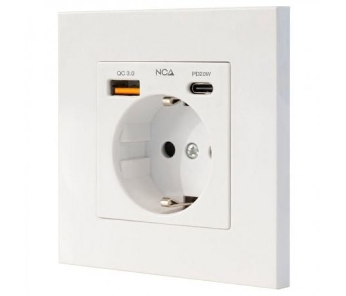 Base de enchufe de pared tipo schuko con 2 tomas USB: USB-A con QC 3.0 y otro USB-C con PD, 20W
