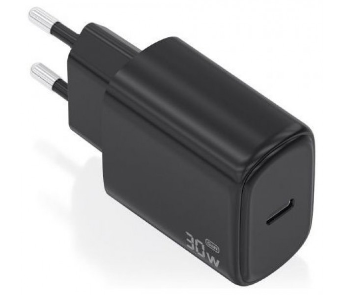 Cargador GaN USB-C de 30W diseñado para cargar portátiles, teléfonos móviles, cámaras y tablets, entre otros dispositivos. Presenta un diseño elegante, moderno y práctico.