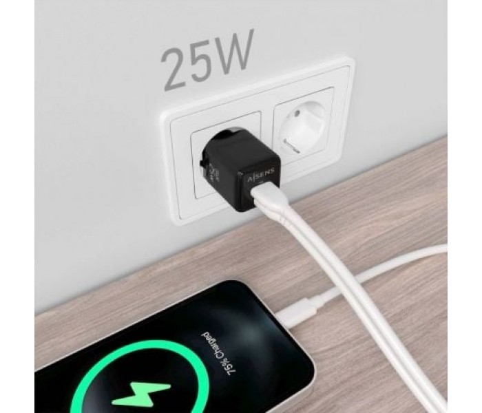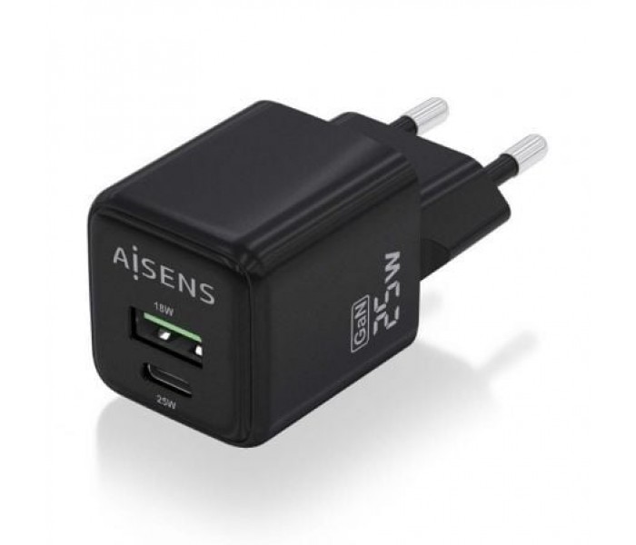 Cargador de Pared GaN Aisens ASCH-25W2P015-BK/ 1xUSB Tipo-C/ 1xUSB/ 25W
