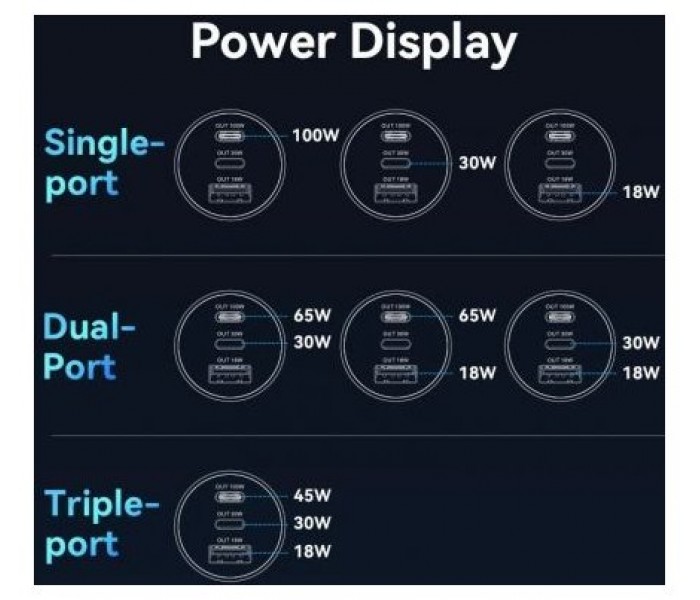 • Salida USB-C2 + USB-A1: 30W + 18W
