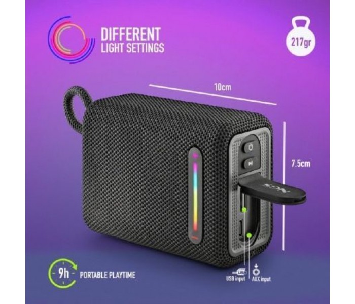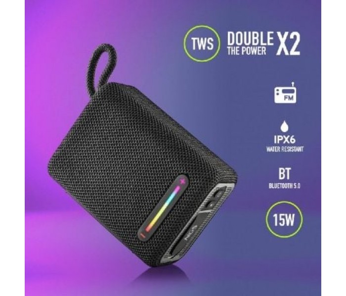 Altavoz inalámbrico compatible con tecnología Bluetooth 5.0 para disfrutar de la música tanto en el interior como en el exterior. Tamaño compacto y portátil, proporciona sonido de alta calidad gracias a su gran potencia de salida, 15W. Diseño robusto con material de tela resistente. Resistente al agua, conforme a la norma IPX6. Amplifica el sonido, puede emparejar dos dispositivos de forma simultánea y aumentar la potencia de sonido gracias a su Tecnología True Wireless. Compatible con la Tecnología Bluetooth: Conecta tu dispositivo vía Bluetooth y reproduce tu música con la mejor calidad de sonido.. Dispone de puerto de entrada USB para conectarle una memoria de hasta 32GB.. Batería recargable de Litio de 3,7V/2500mAh que puede reproducir música hasta 9 horas (50 % de volumen). Controla tu música desde el altavoz con los sencillos botones integrados. Equipado con un cable de carga USB tipo C para cargarlo cómodamente. Incluye correa de transporte. El alcance del móvil para la reproducción de música es de hasta 10m. . Especificaciones:. . . Compatible con bluetooth . TWS (consigue doble potencia conectando 2 altavoces al mismo tiempo sin cables) . Potencia pico de salida: 15W. Potencia RMS: 7W. Entrada de audio AUX . Entrada de audio USB: hasta 32GB. Control de volumen . Batería: Ion-Li 3,7V/2500mAh. Tiempo de funcionamiento: 9 horas. Resistente al agua: IPX6. Frecuencia de operación: 2402-2480MHz. Potencia máxima de salida de RF: 4dBm. Formatos de audio: MP3/WAV/WMA