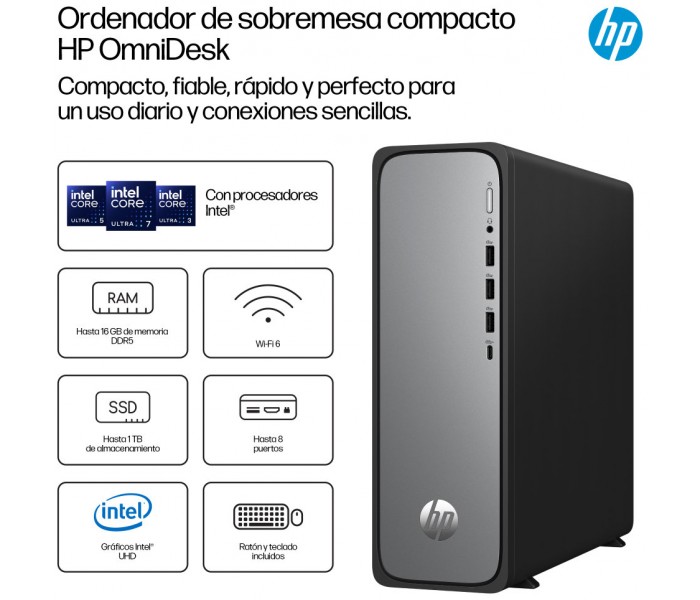 El ordenador de sobremesa compacto HP OmniDesk te permite gestionar fácilmente las tareas diarias, desde la organización de fotos familiares hasta la retransmisión de programas o la gestión de presupuestos. Este compacto y fiable ordenador de sobremesa cuenta con los últimos procesadores Intel[1], una amplia memoria para transferencias de datos rápidas, los últimos puertos de fácil acceso y una tecnología Wi-Fi rápida y fiable[3].