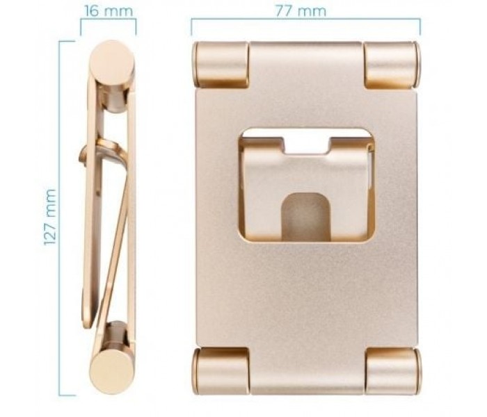 | Características | - Soporte de mesa ajustable y giratorio para teléfono / tablet de hasta 10” - Material: Fabricado en aleación de aluminio - Dispone de almohadillas de silicona antideslizantes, para proteger de arañazos y deslizamientos. - Plegado compacto del soporte para facilitar su guardado y transporte. - Medidas del producto plegado: 77 x 127 x 16 mm - Color: Dorado - Peso: 0,218 kg |