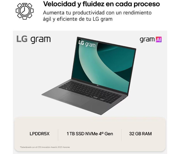 Con una batería de alta capacidad de hasta 28,5 horas y nuestro asistente inteligente AI, gram se adapta a tu entorno y ofrece un rendimiento optimizado durante más horas. Aumenta tu productividad y disfruta de un juego sin interrupciones.