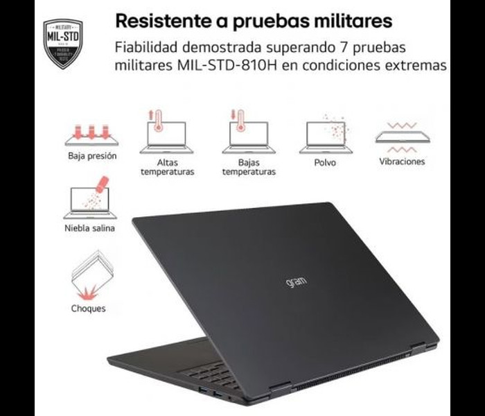 Con solo 1,12 kg de peso y un grosor de hasta 16,9 mm, el LG gram 14 ofrece una portabilidad extraordinaria sin renunciar a la resistencia. Su chasis de aluminio cumple con el estándar militar MIL-STD 810H, superando pruebas de caída, presión, humedad y temperaturas extremas.