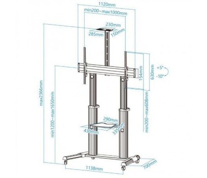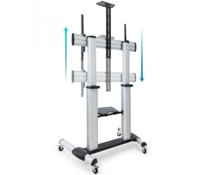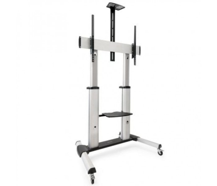 Especificaciones:. . Pantallas soportadas: 60""-100"". Compatible con VESA: Máximo 1000x600. Mínimo 200x200. Peso máximo soportado de pantalla: 100 kg. ángulo de inclinación: +5º/-10º. Bandeja inferior para reproductor/DVD y bandeja superior regulable para webcam. Rango de ajuste de altura del soporte: 1200-1650 mm. Altura máxima con bandeja superior: 2366 mm. Medida de bandejas: Inferior 430x335 mm Superior 285x150 mm. Distancia entre ruedas: 1138x700 mm. Ruedas con sistema de bloqueo. Sistema de organización de cables. Color: Plata. Peso neto: 30 kg. Peso bruto: 33,40 kg. Medidas del embalaje: 1206x655x250 mm